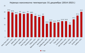 Na slici je prikazana najviša dnevna temperatura izmjerena 31. decembra u posljednjih deset godina (2014-2023.) kao i godina pojave: