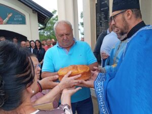 Nakon trokratnog ophoda oko svetinje i parastosa poginulim borcima u Odmrambeno-otadžbinskom ratu iz Mirosavaca i Milinog sela, slomljen je slavski kolač.