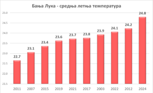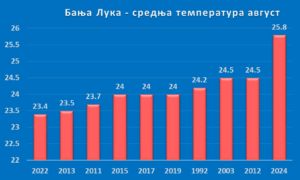 Na slici su prikazane srednje temperature u 10 najtoplijih avgusta u Banjaluci. Od deset najtoplijih, čak 9 je iz perioda posle 2000. godine.