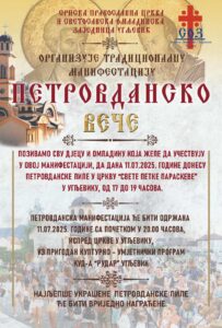 Srpska pravoslavna crkva i Svetosavska omladinska zajednica Ugljevik organizuju tradicionalnu manifestaciju „Petrovdansko veče“ u porti ugljevičkog hrama Prepodobne mati Paraskeve u petak 11. jula sa početkom u 20.00 časova.