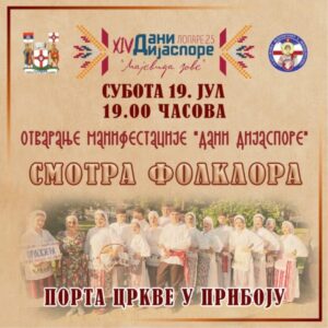 Manifestacija „Dani dijaspore“ Lopare 2025 biće otvorena sutra (19. jula) u 19.00 časova u porti pribojske crkve. Nakon otvaranja počinje Festival folklora gdje će nastupiti folklorne grupe na otvorenoj sceni kod stare škole u Priboju.