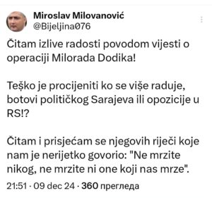 „Čitam izlive radosti povodom vijesti o operaciji Milorada Dodika. Teško je procjeniti ko se više raduje, botovi političkog Sarajeva ili opozicije u RS?