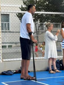 On je sedeo u kafiću koji je u sklopu sportskog kompleksa, ali je zatim ustao i odšetao do terena kako bi pozdravio decu koja treniraju, ali i neke prijatelje.