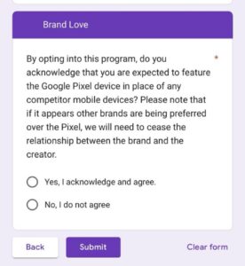 Kako se navodi, kompanija je od učesnika takozvanog „Team Pixel“, grupe influensera koji među prvima imaju pristup tehnološkim proizvodima, očekivala da preferiraju Google Pixel telefone u odnosu na konkurentske proizvode.