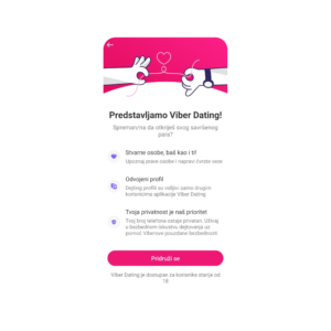 Kao sinonim za sigurnu komunikaciju više od decenije, Viber je već godinama pouzdan kanal za razgovore novih parova u kasnijim fazama upoznavanja. Sada rešava i prvi korak – omogućava ljudima da pronađu kompatibilnog partnera po brojnim kriterijumima. Za razliku od drugih dejting aplikacija, korisnici mogu lako prebaciti komunikaciju sa Viber Datinga na glavnu Viber aplikaciju i nastaviti građenje odnosa u bezbednom okruženju, uz end-to-end enkripciju i bez čuvanja poruka na Viberovim serverima.